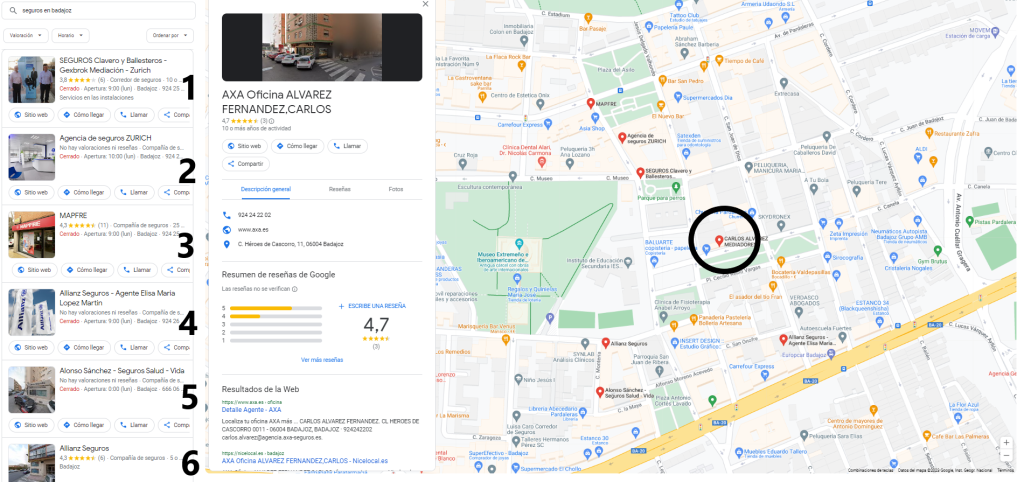 Así sales, o NO sales, en la búsqueda de «agencia de seguros en Badajoz» en el rango de la foto, es decir, en los alrededores de tu oficina.
