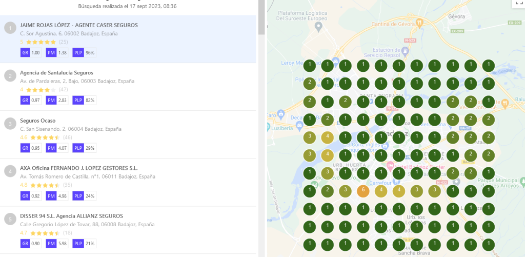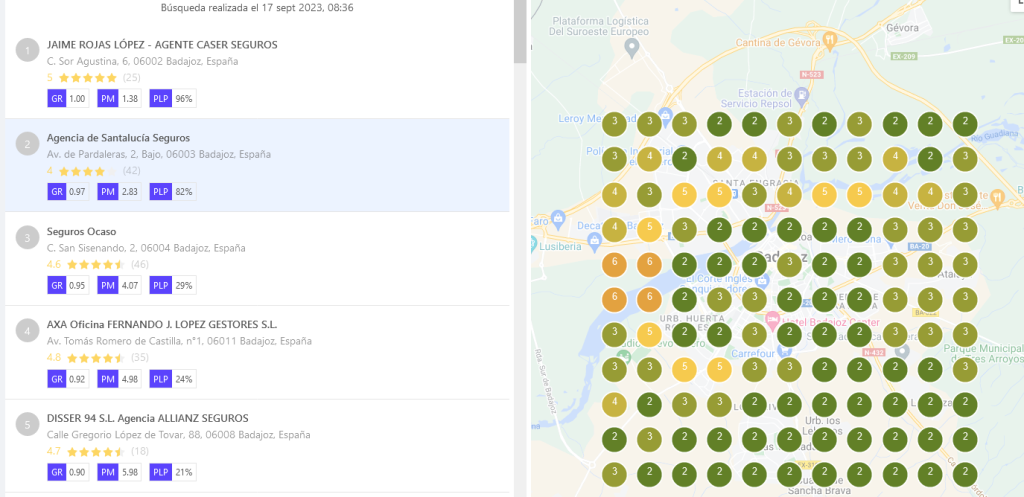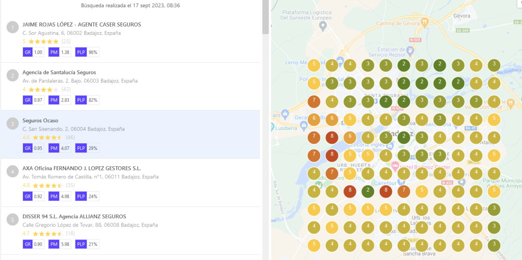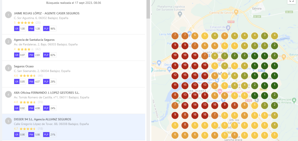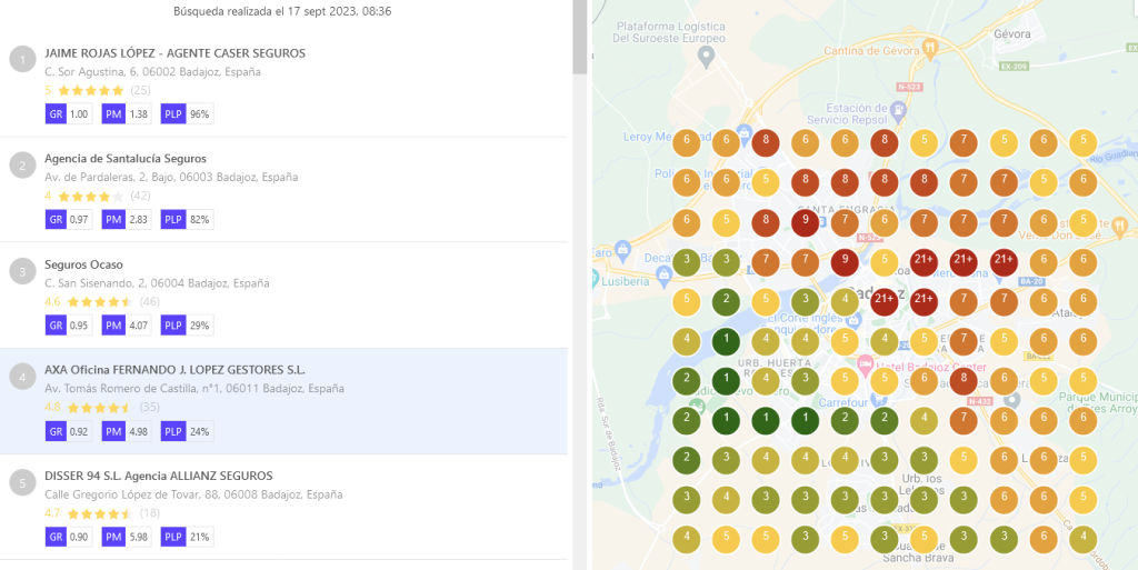 Estas son las fotos de cómo están posicionadas las 5 mejores «agencias de seguros» si dividimos la ciudad en cuadrantes, hasta 4 kms